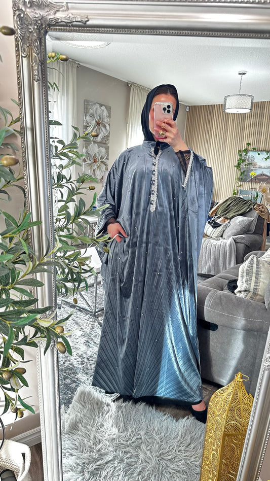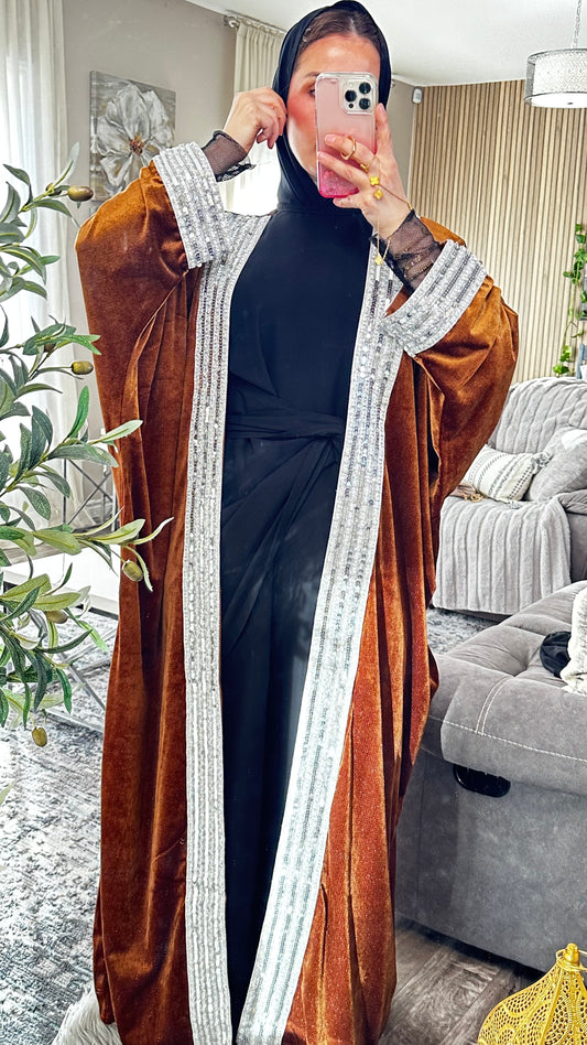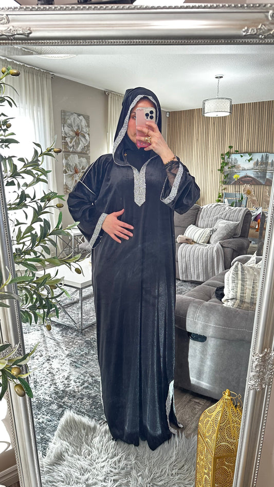 This velvet sequined abaya blends traditional craftsmanship with refined modern style. Designed for graceful movement...