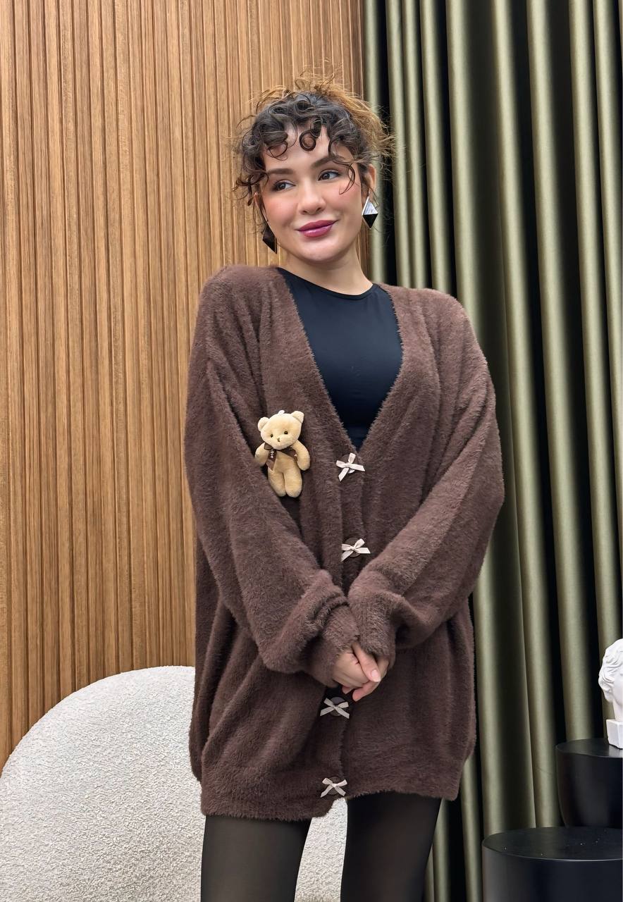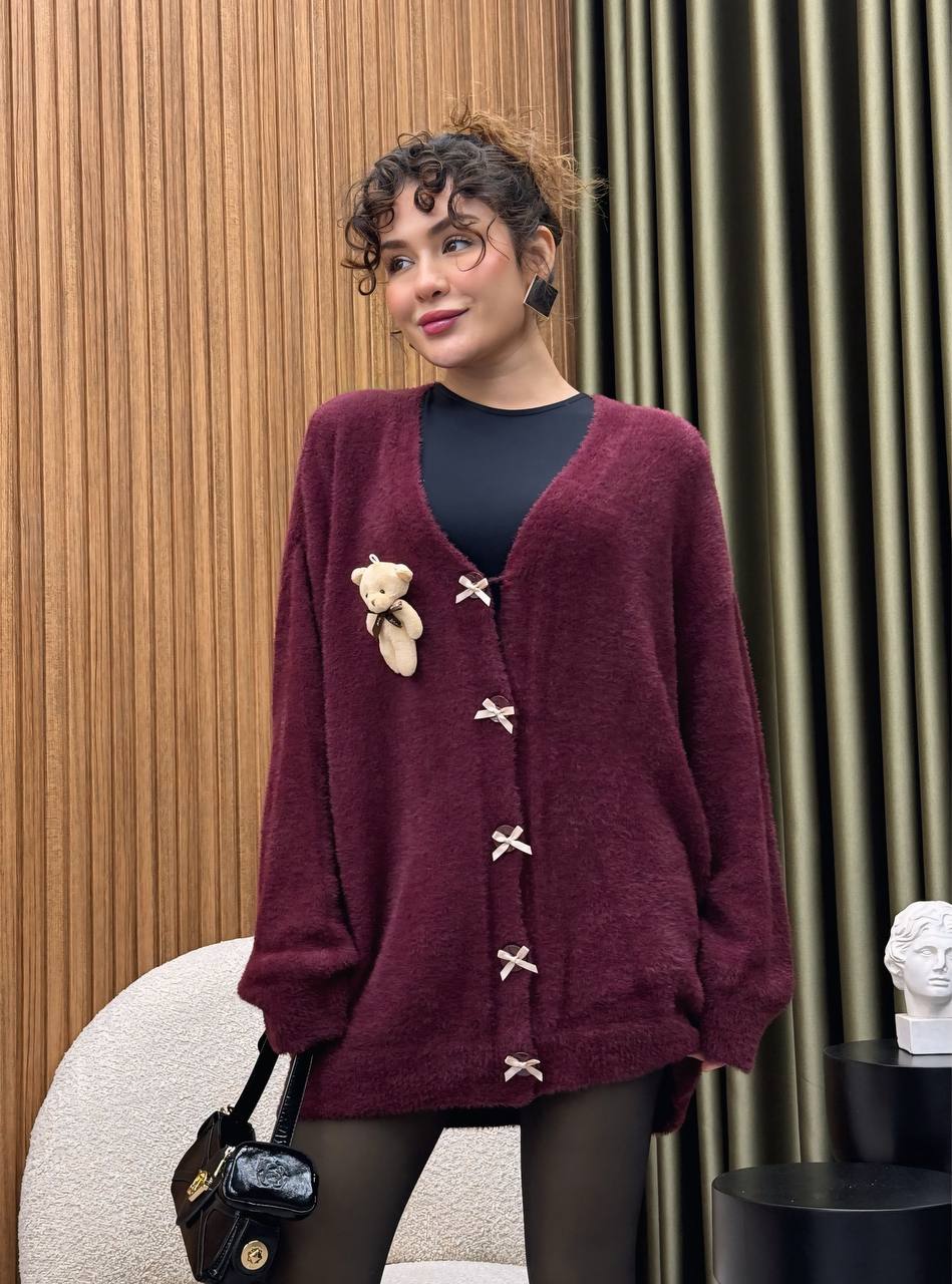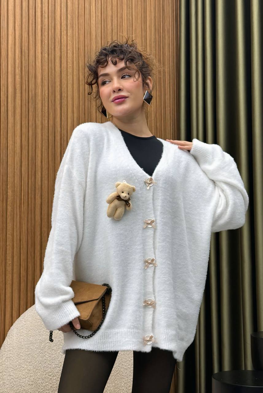 Oversized Bow-Button Cardigan with Teddy Bear Accent – Cozy Statement Layer