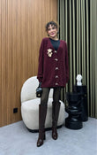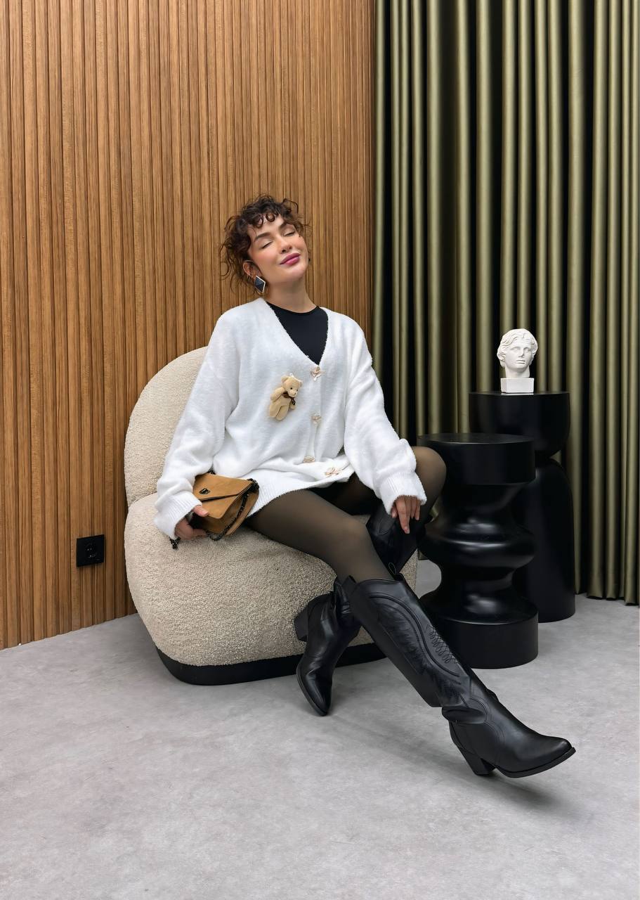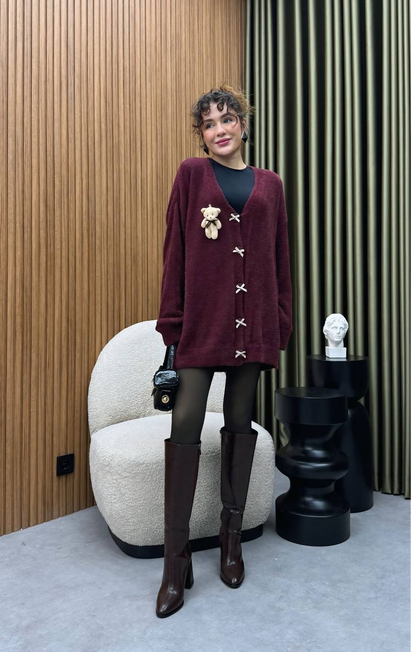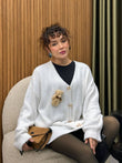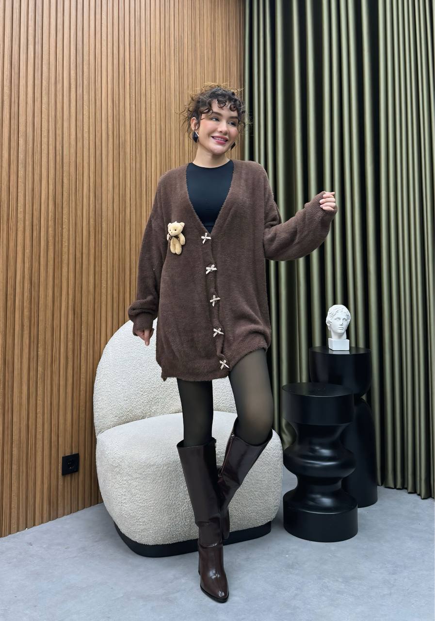 Oversized Bow-Button Cardigan with Teddy Bear Accent – Cozy Statement Layer