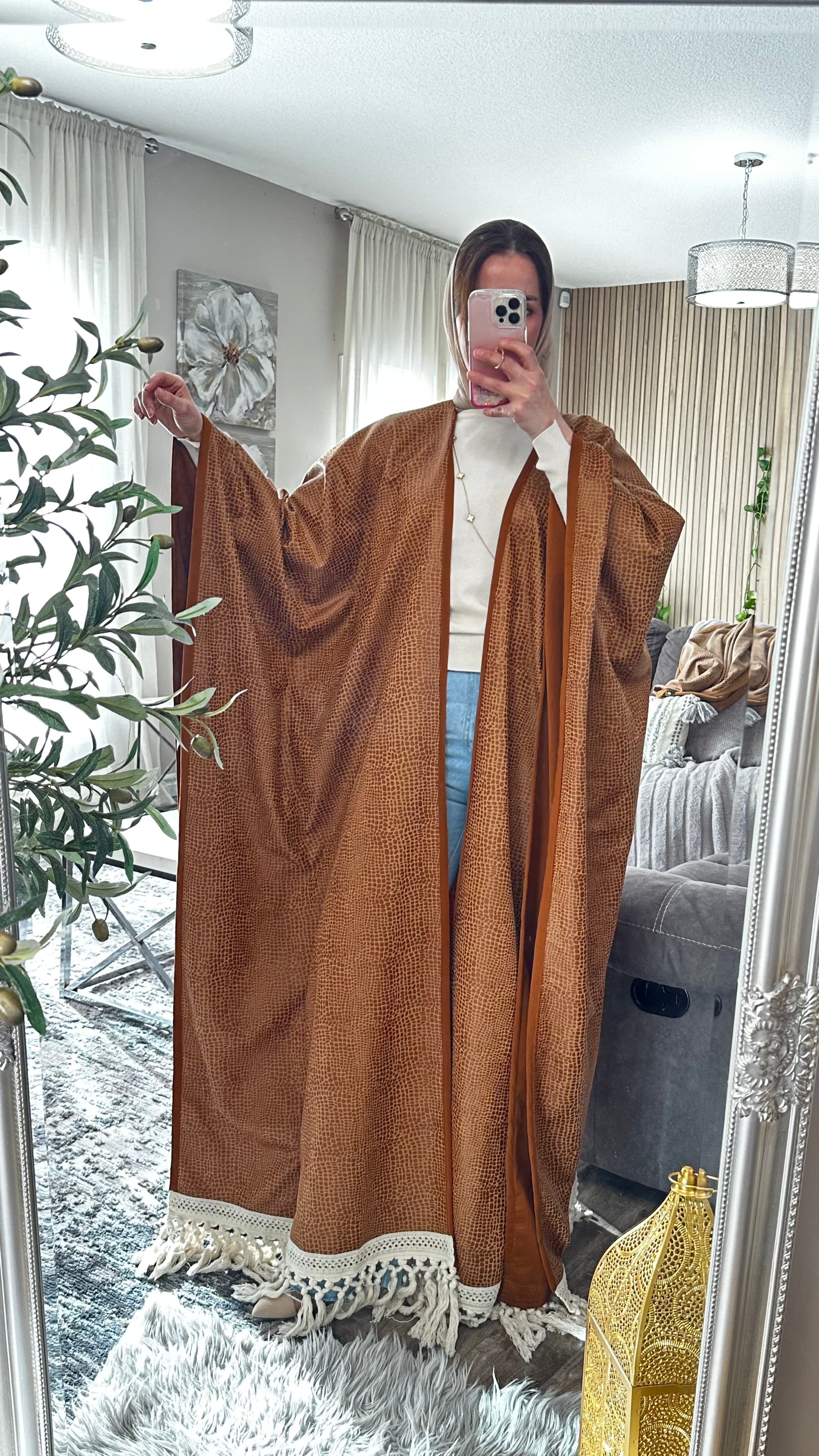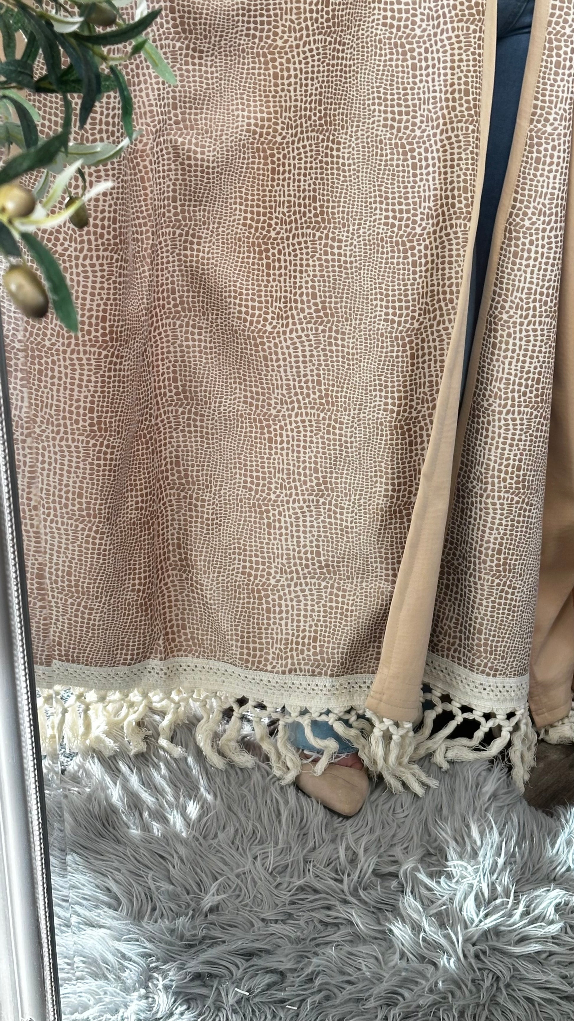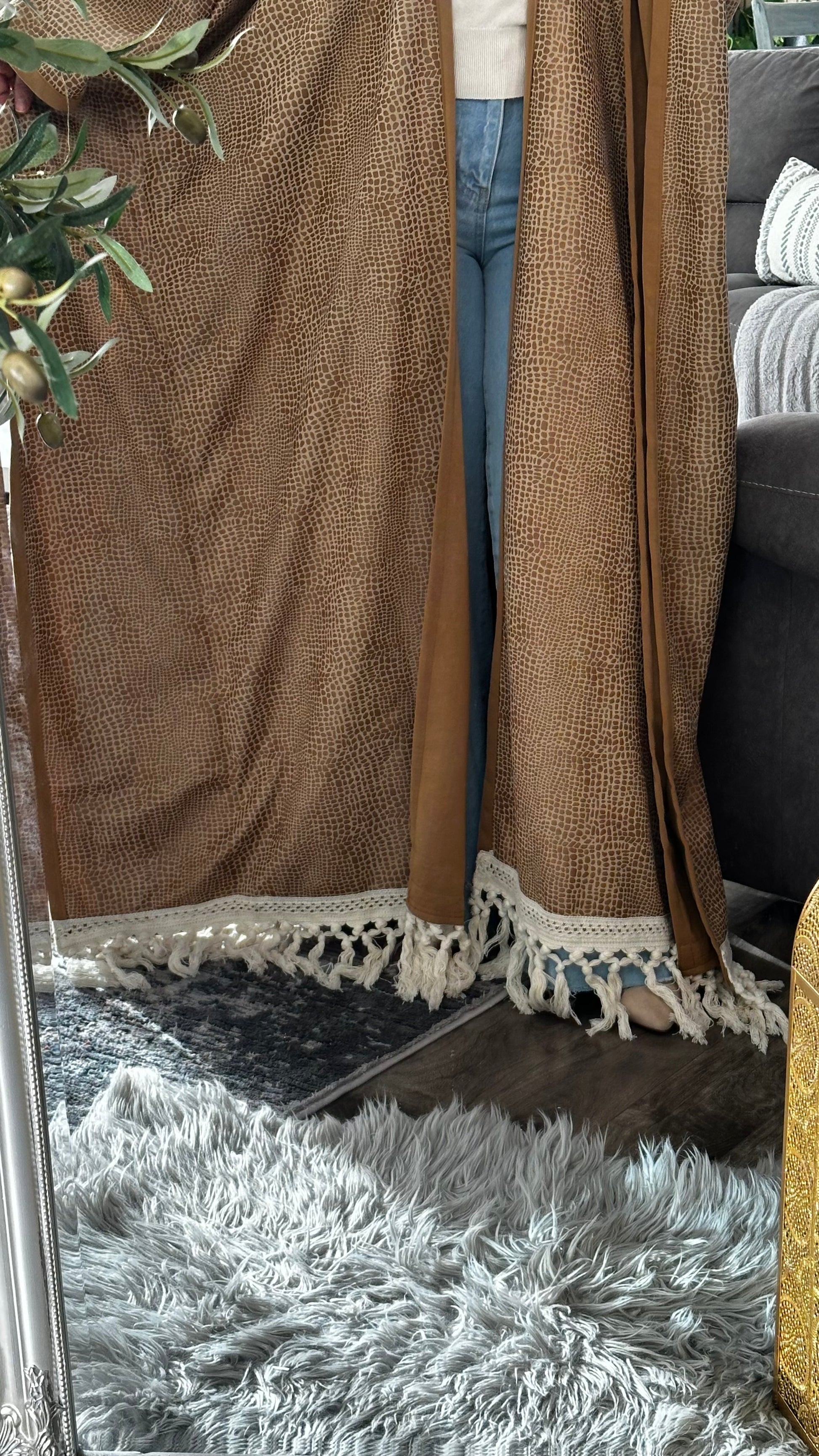 This suede Becht abaya is a refined blend of texture, movement, and modest sophistication. Designed for women who appreciate artisanal detail and timeless silhouettes, it features a reptile-inspired pattern and fringe trim that adds dynamic flair. Ideal for transitional seasons, elevated casual wear, or cultural gatherings, this piece offers comfort and visual impact in equal measure.