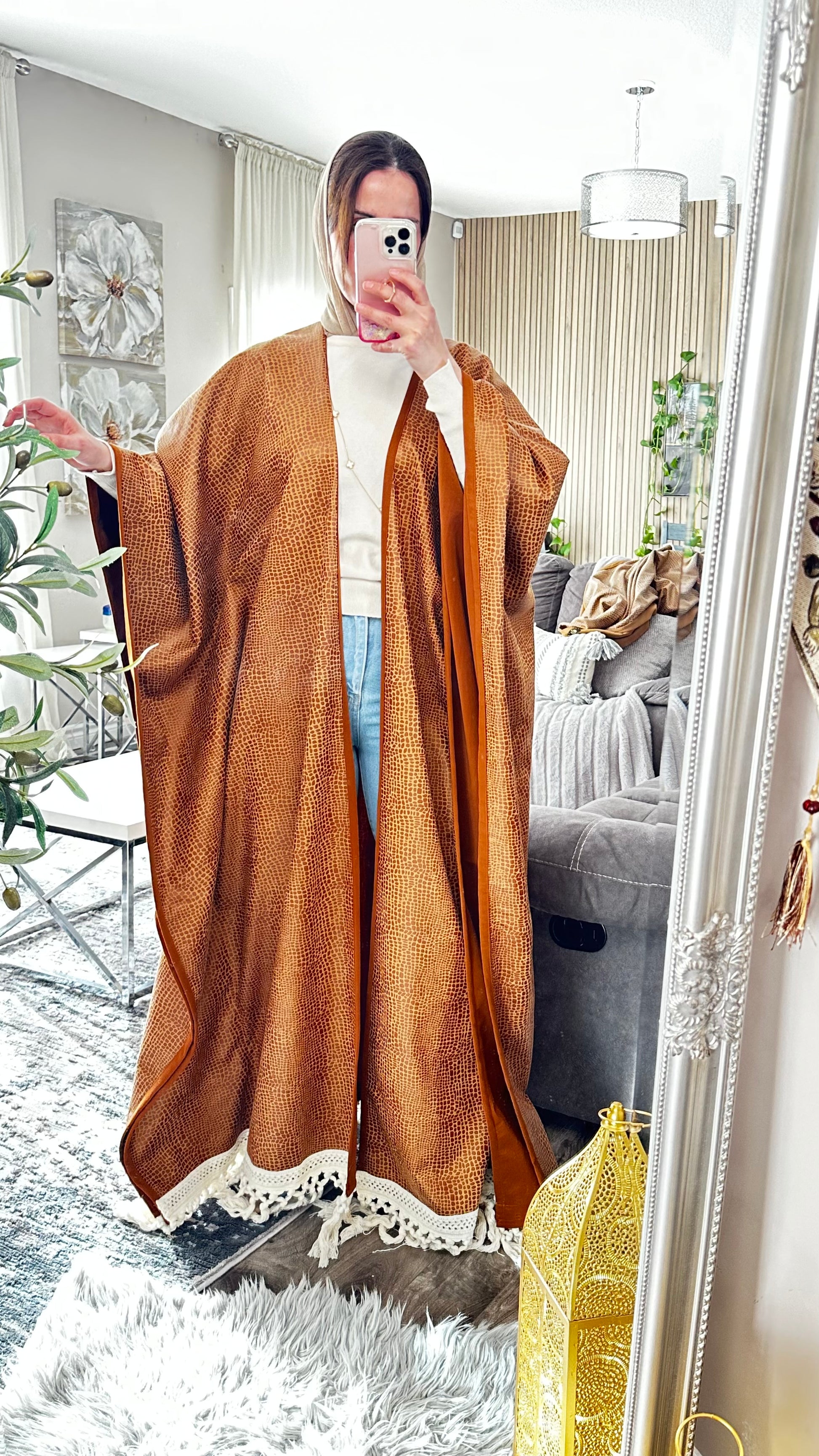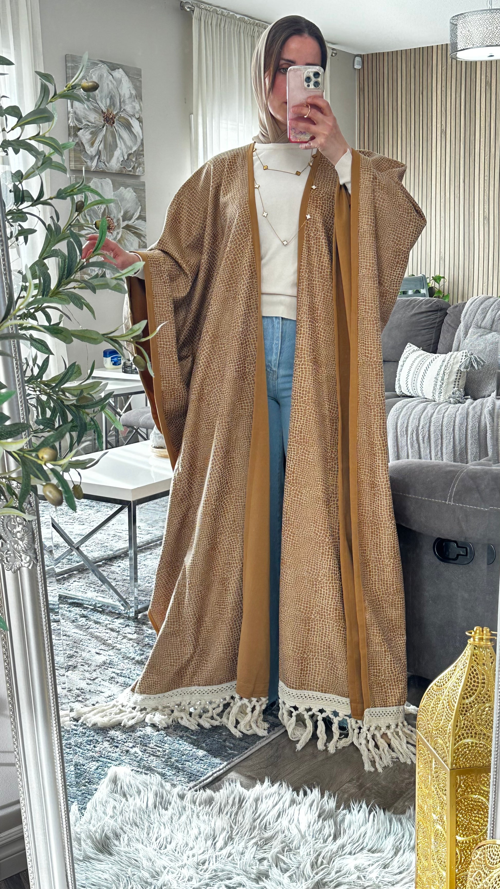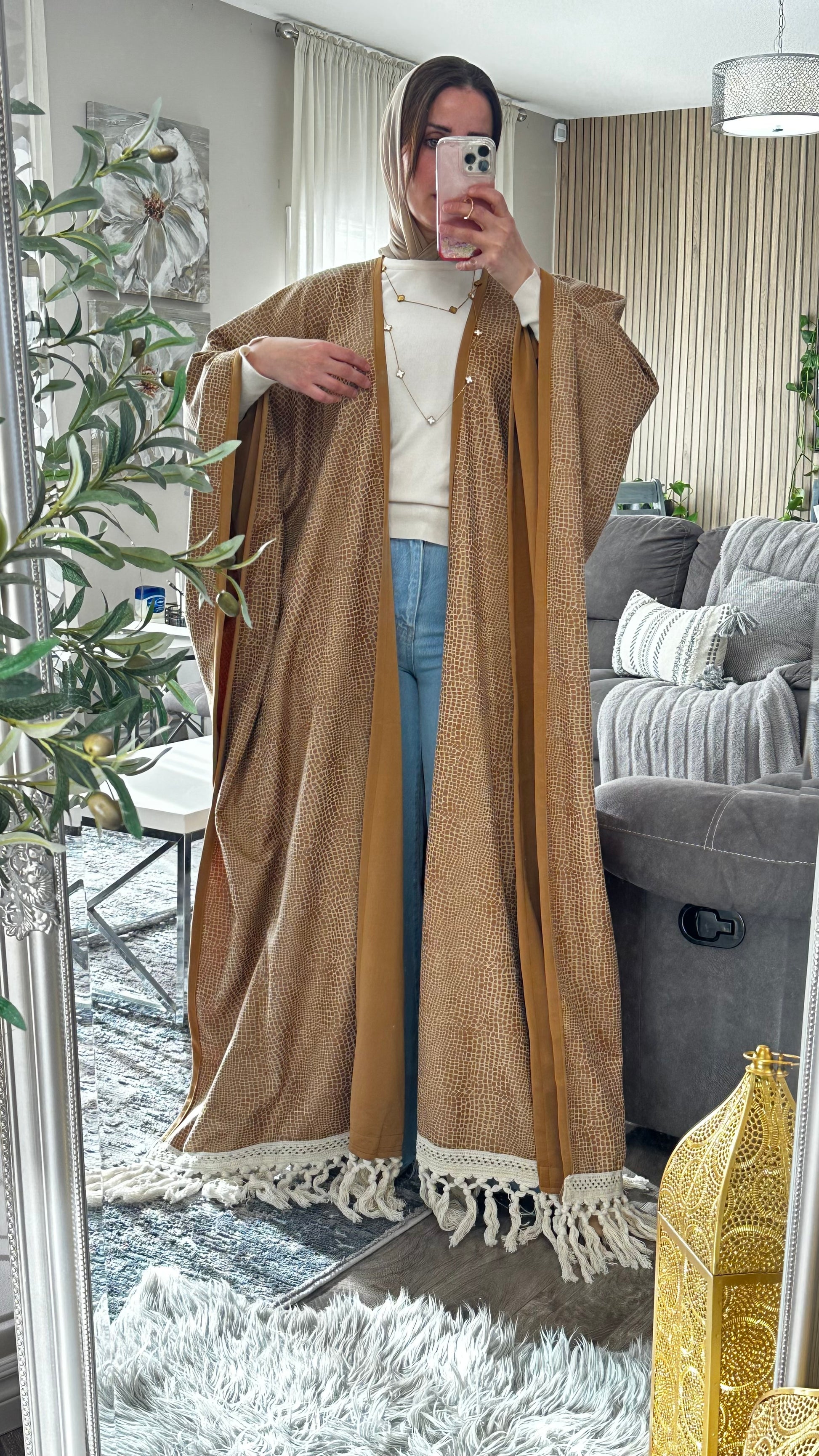 This suede Becht abaya is a refined blend of texture, movement, and modest sophistication. Designed for women who appreciate artisanal detail and timeless silhouettes, it features a reptile-inspired pattern and fringe trim that adds dynamic flair. Ideal for transitional seasons, elevated casual wear, or cultural gatherings, this piece offers comfort and visual impact in equal measure.