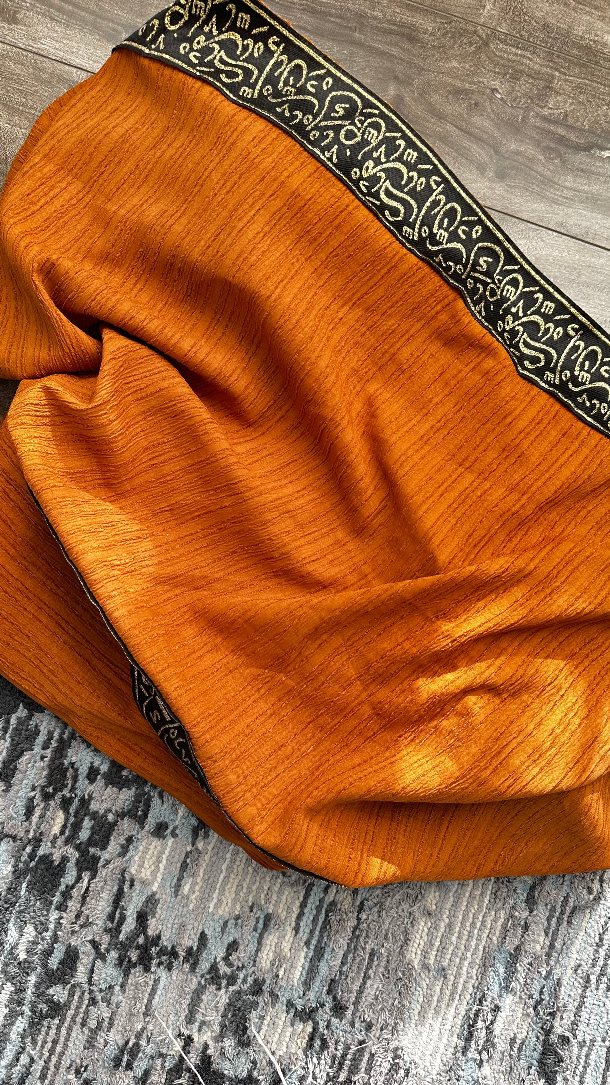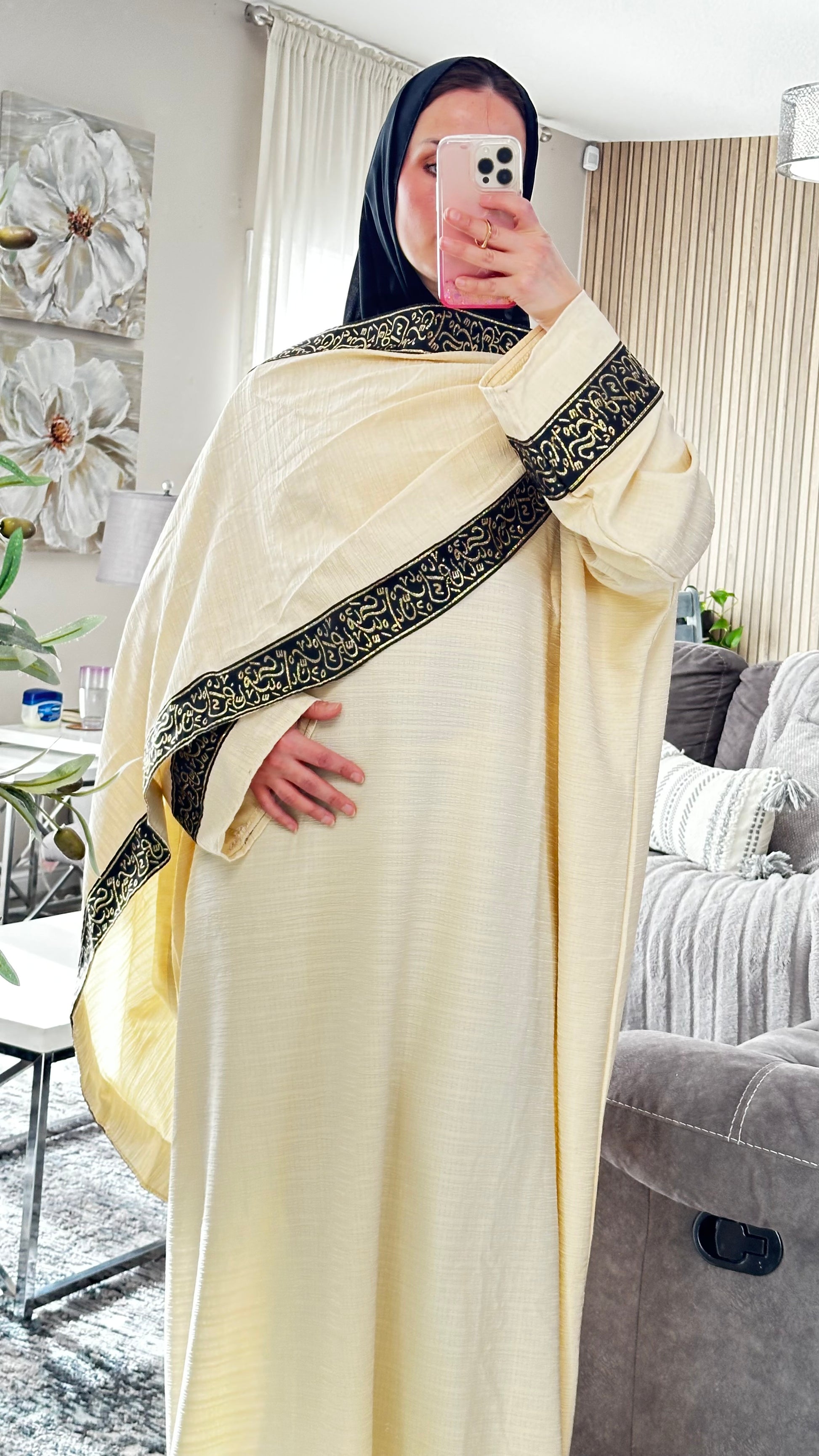 • Embroidered Arabic calligraphy trim along the front and sleeves