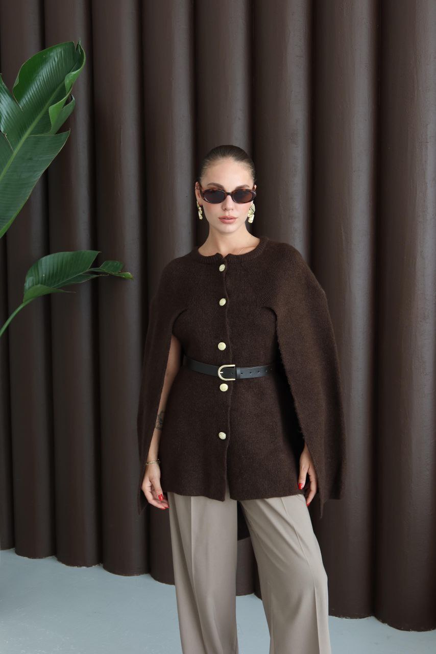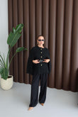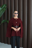 Command attention with this elegant cape-style blouse and trouser set, crafted for women who embrace modest fashion with a bold edge. The structured cape top features gold button accents and a cinched waist belt that flatters the silhouette, while the wide-leg trousers offer comfort and sophistication. Available in rich tones like black, burgundy, and chocolate brown, this set is perfect for formal events, professional settings, or upscale streetwear.