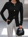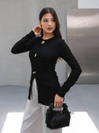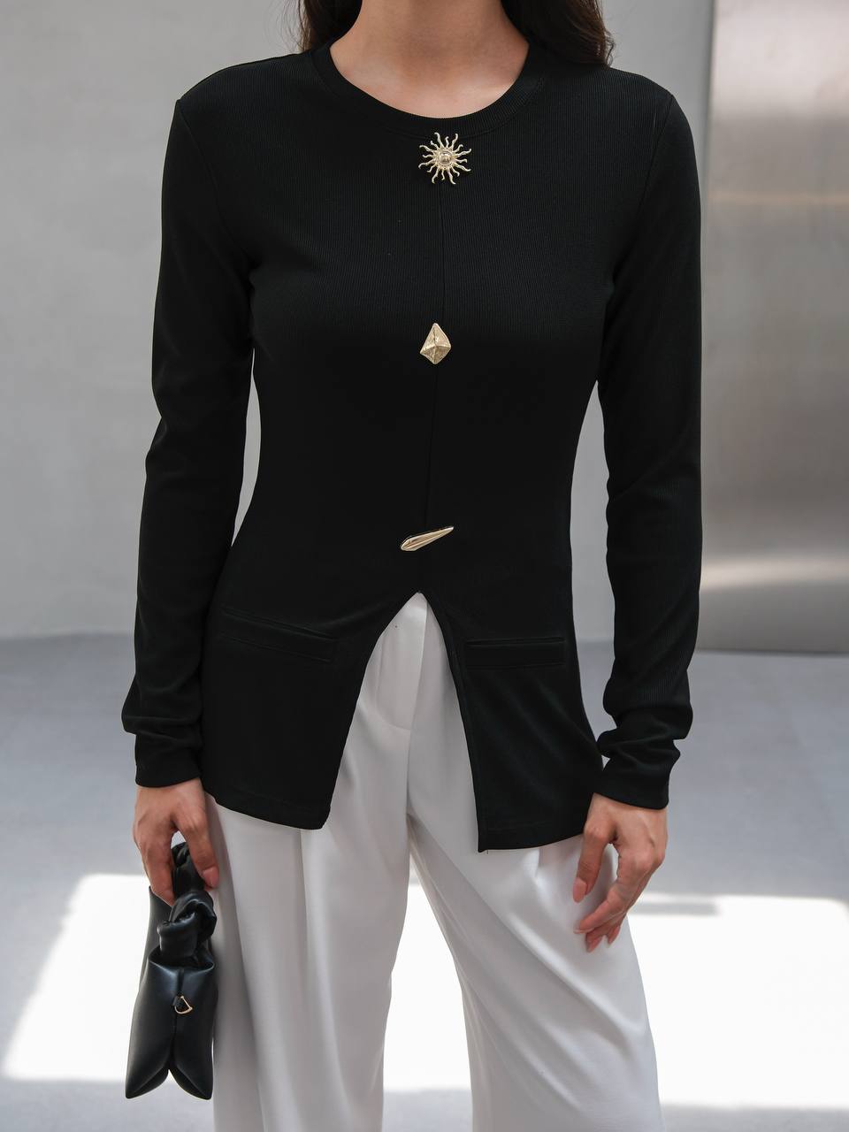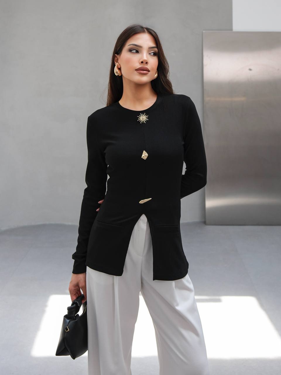 • Top: Fitted tunic with gold embellishments and front slit detail