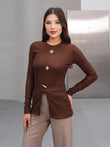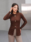 Make a bold yet refined statement with this two-piece embellished tunic set, crafted for women who appreciate modest fashion with a luxurious edge. The long-sleeve fitted top features striking gold accents, including a sunburst ornament and decorative buttons, paired with high-waisted tailored trousers for a sleek silhouette. Available in rich tones like espresso brown and classic black, this set is perfect for formal gatherings, business wear, or upscale day-to-night styling.