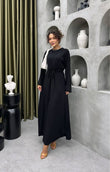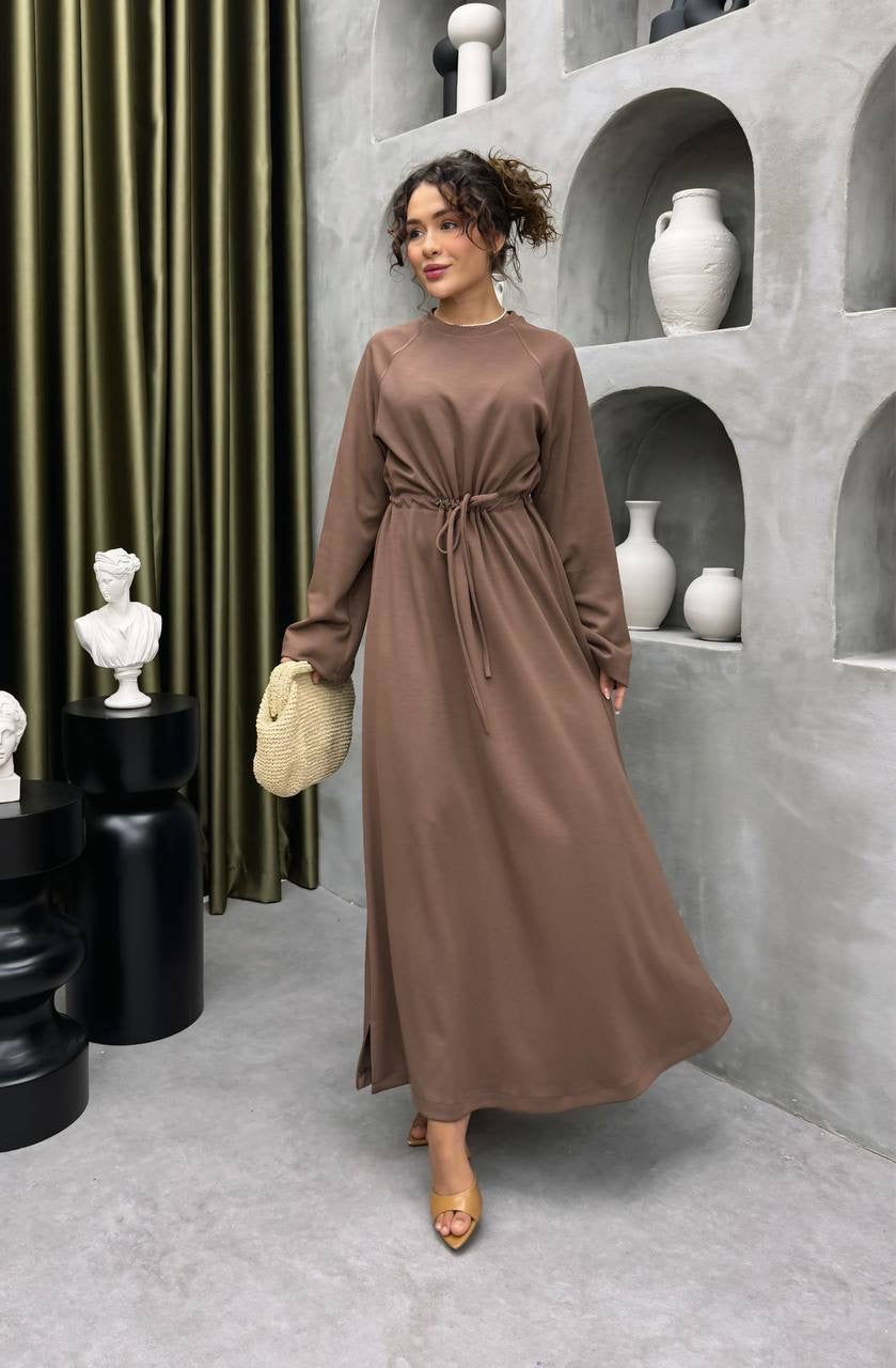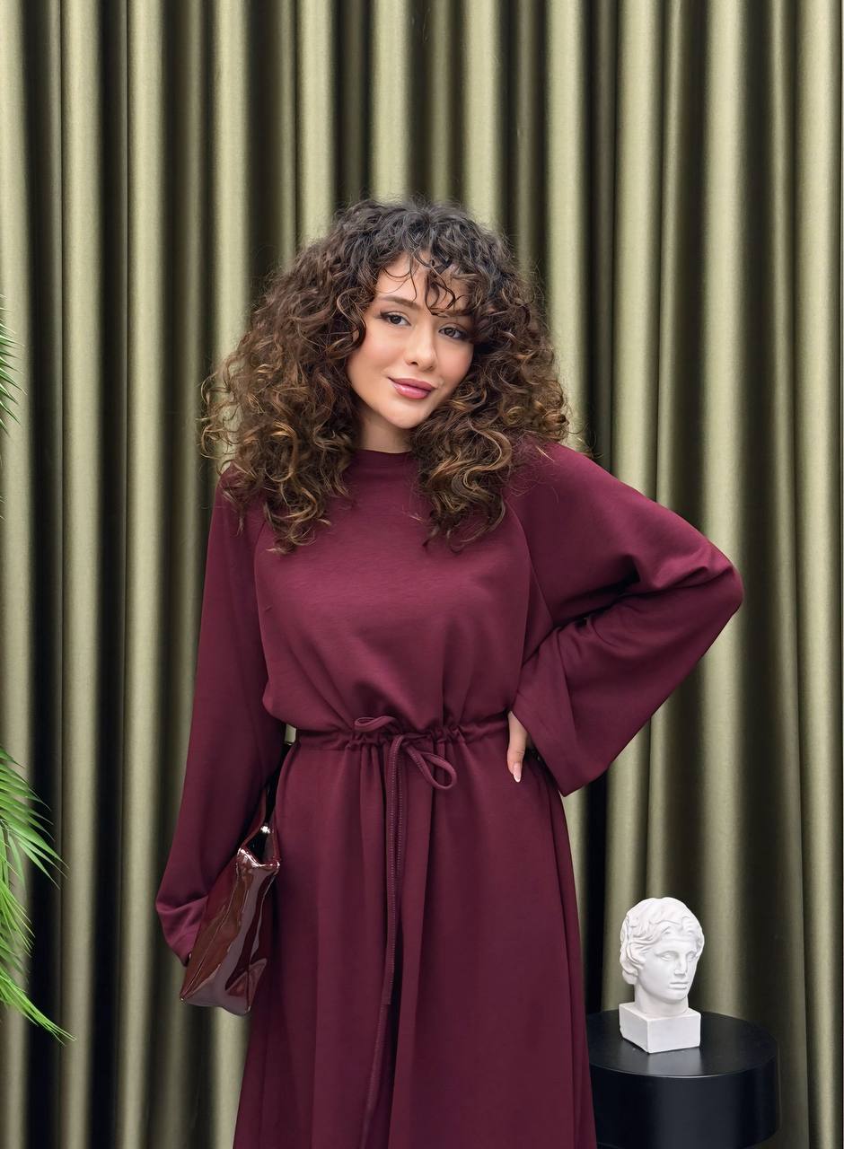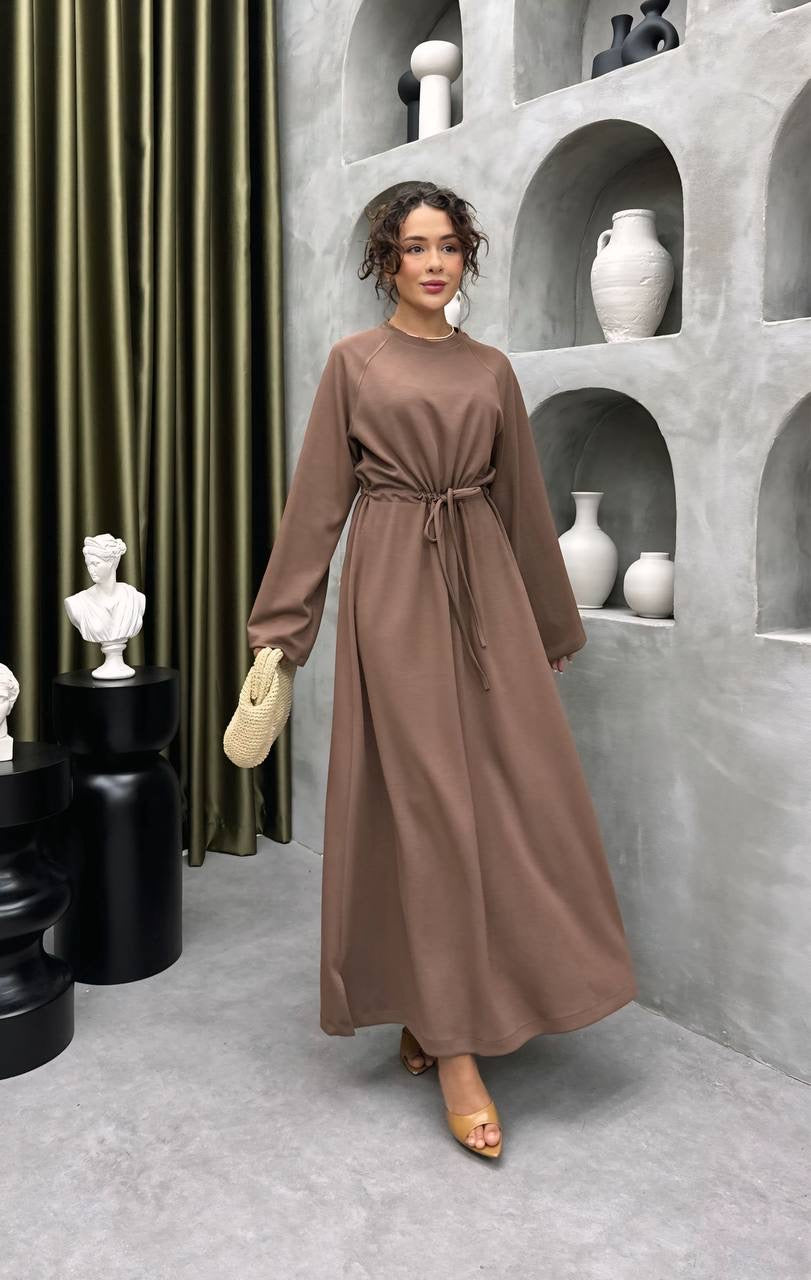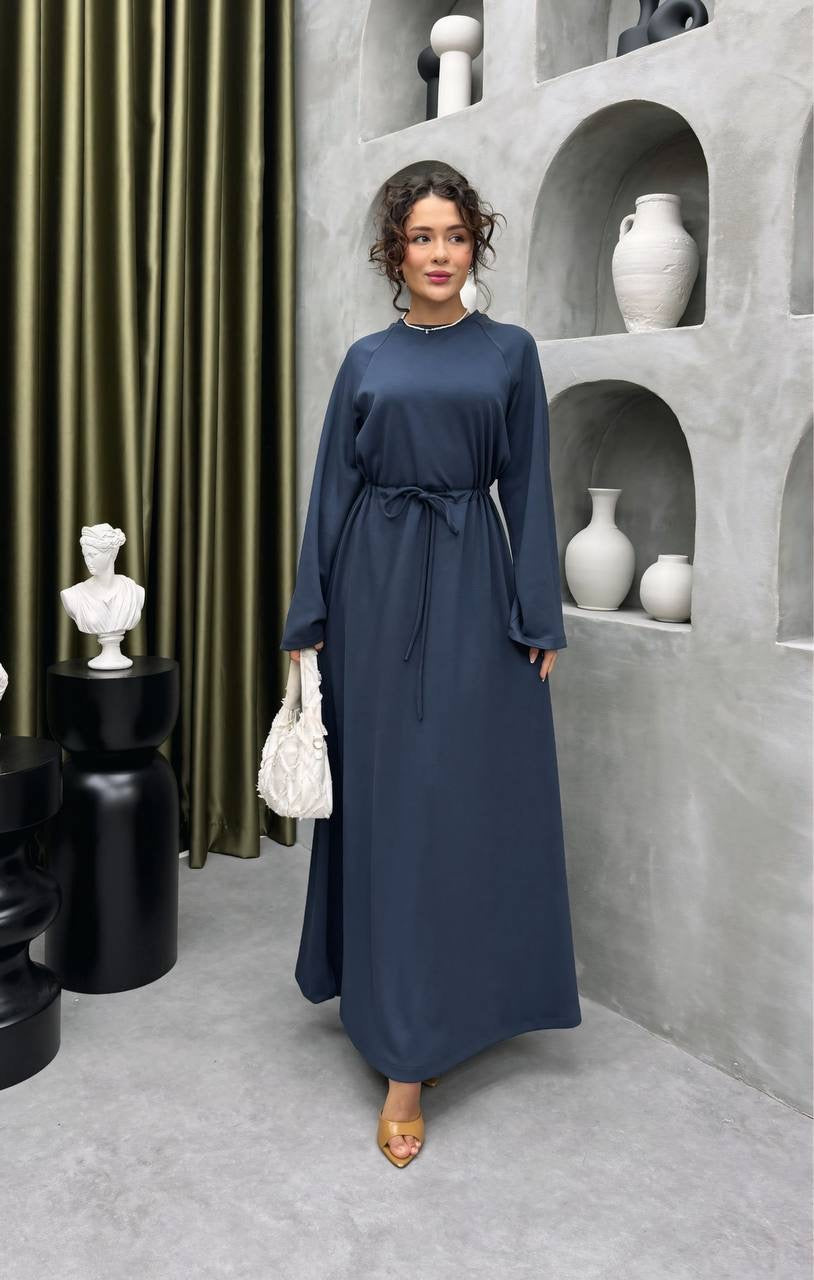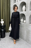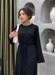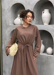 This long belted dress features a sleek silhouette with full-length sleeves and a flattering waist tie. Perfect for refined everyday wear or elevated occasions, it blends timeless elegance with modern simplicity.