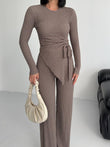 Step into effortless elegance with this two-piece textured wrap set, designed for women who love comfort without compromising style. Featuring a long-sleeve wrap top with a flattering tie waist and matching wide-leg pants, this outfit blends modesty with modern flair. The rich texture and neutral tones make it perfect for casual outings, cozy indoor wear, or elevated street style.