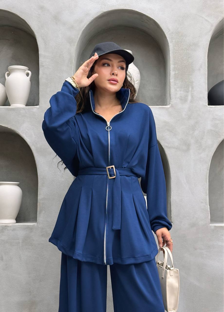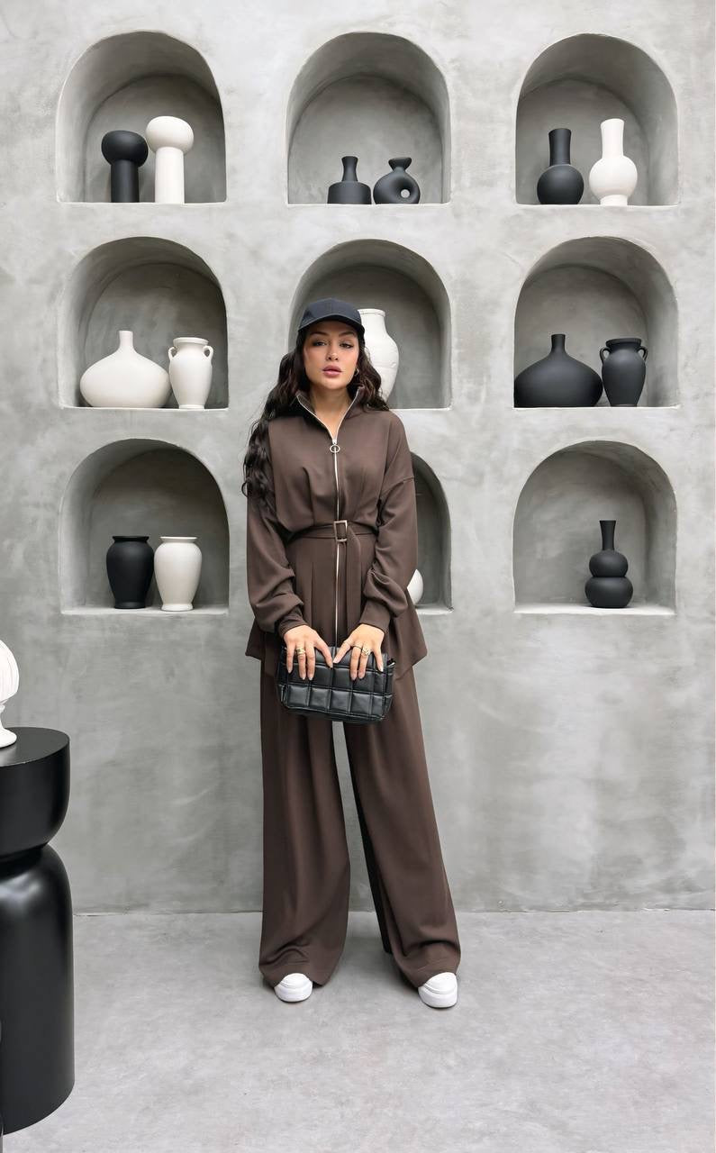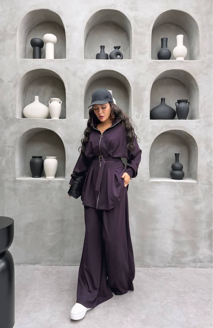 Step into sleek sophistication with this two-piece zip-up belted set, designed for women who love modest fashion with a modern edge. The long-sleeve tunic features a front zipper and structured belt that cinches the waist for a flattering silhouette, while the matching wide-leg pants offer comfort and elegance. Available in rich tones like deep purple, navy, blue, and taupe, this set is perfect for casual outings, travel, or elevated streetwear.