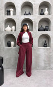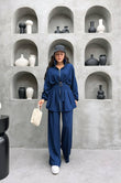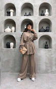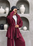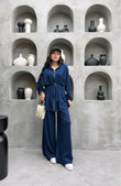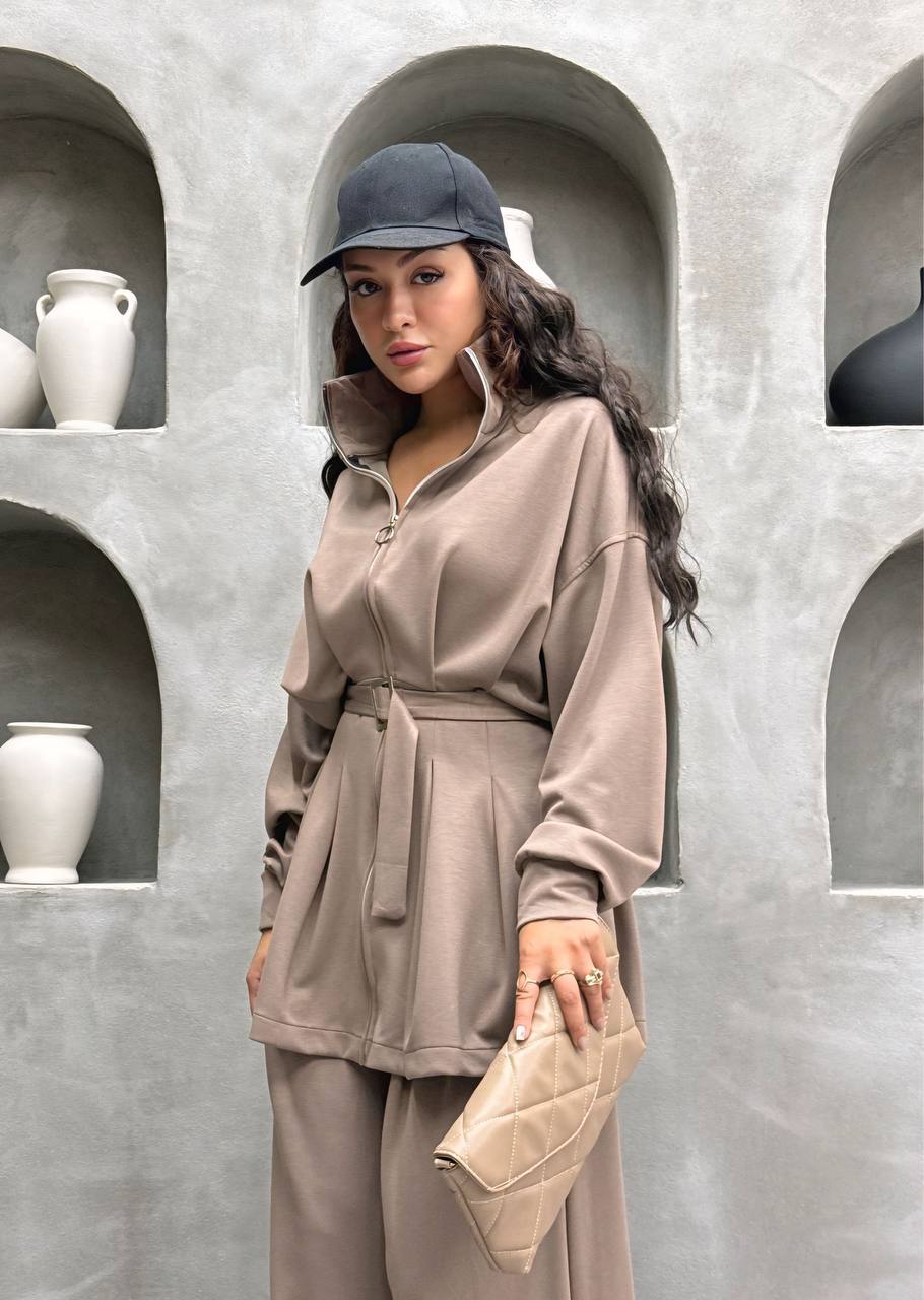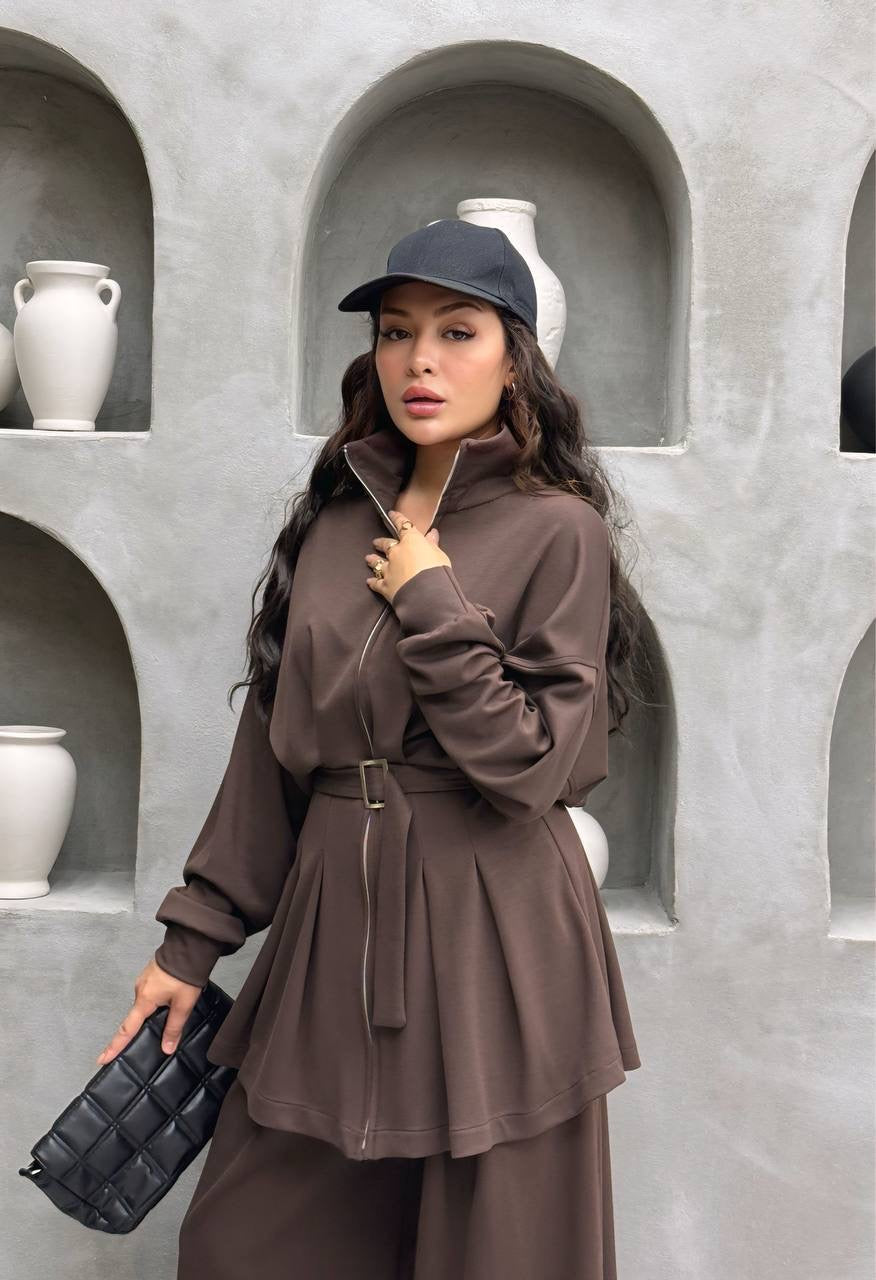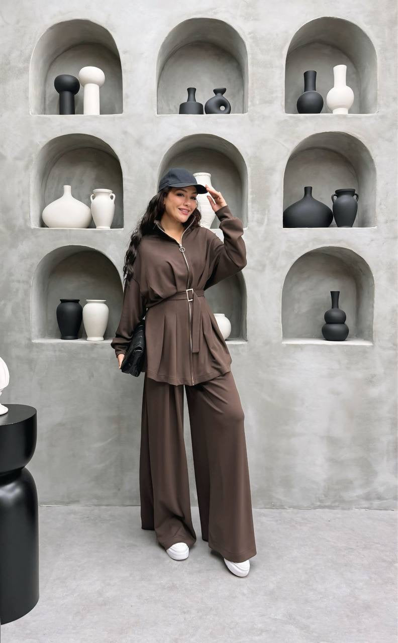 Step into sleek sophistication with this two-piece zip-up belted set, designed for women who love modest fashion with a modern edge. The long-sleeve tunic features a front zipper and structured belt that cinches the waist for a flattering silhouette, while the matching wide-leg pants offer comfort and elegance. Available in rich tones like deep purple, navy, blue, and taupe, this set is perfect for casual outings, travel, or elevated streetwear.