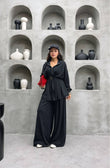 • Bottom: High-waisted wide-leg pants with relaxed fit